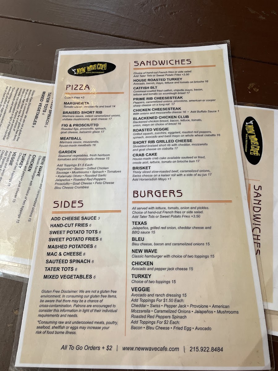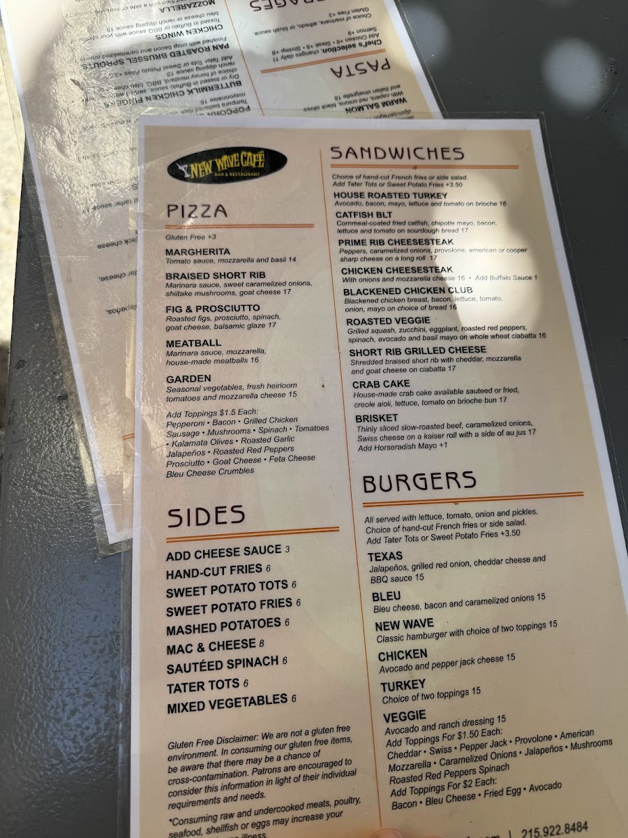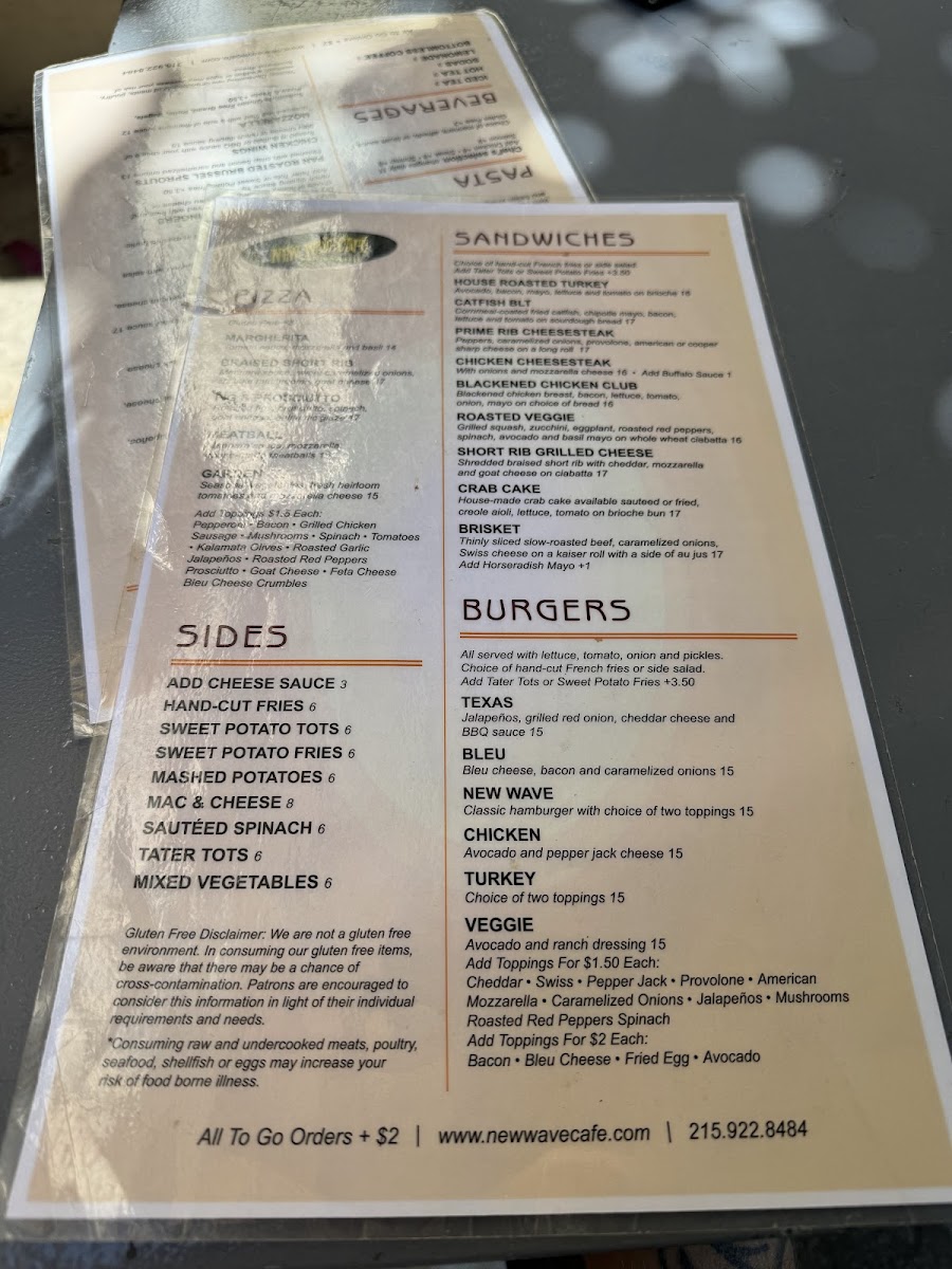 Burgers include selections such as the Texas Burger with jalapenos and BBQ sauce, Bleu Burger with bleu cheese and bacon, the classic New Wave Burger with customizable toppings, as well as chicken and veggie burgers featuring avocado and cheese options. The pasta offerings consist of a daily chef’s selection that varies regularly.
