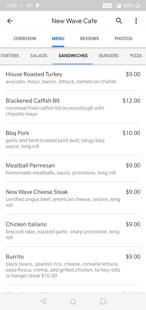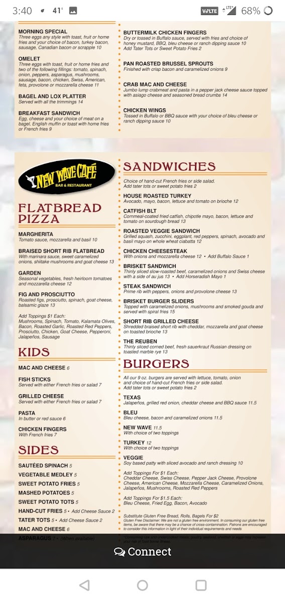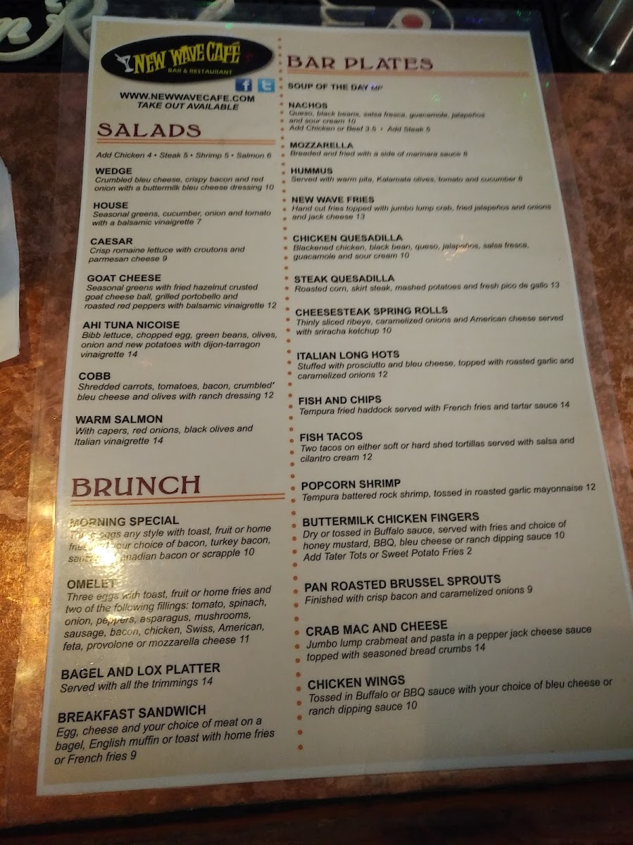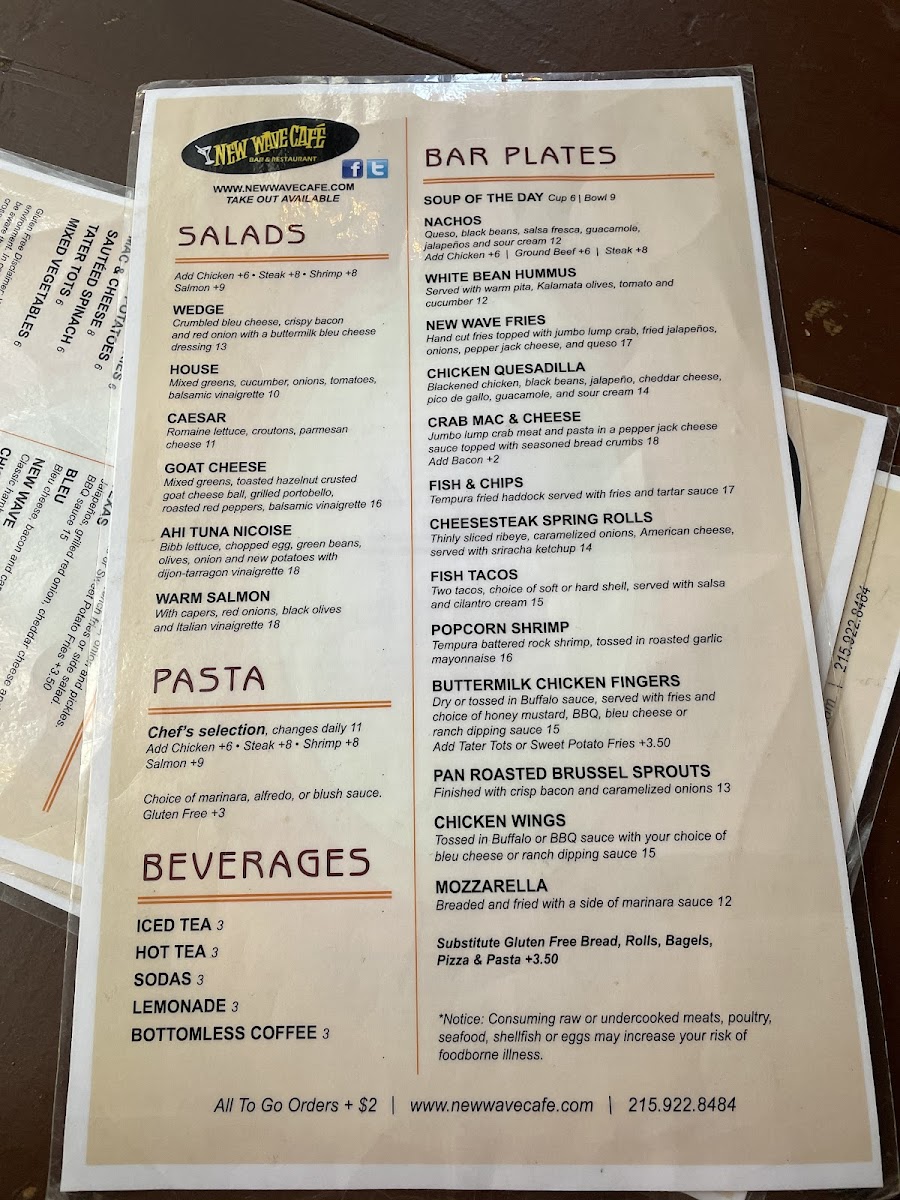 Burgers include selections such as the Texas Burger with jalapenos and BBQ sauce, Bleu Burger with bleu cheese and bacon, the classic New Wave Burger with customizable toppings, as well as chicken and veggie burgers featuring avocado and cheese options. The pasta offerings consist of a daily chef’s selection that varies regularly.